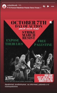 The university’s chapter of Students for a Democratic Society and Columbia University Apartheid Divest promoted a rally outside Fox News’s headquarters organized by Within Our Lifetime (WOL). The flyer included a red upside-down triangle, a symbol Hamas uses to denote Israeli targets, and text reading “STRIKE MARCH RESIST.”