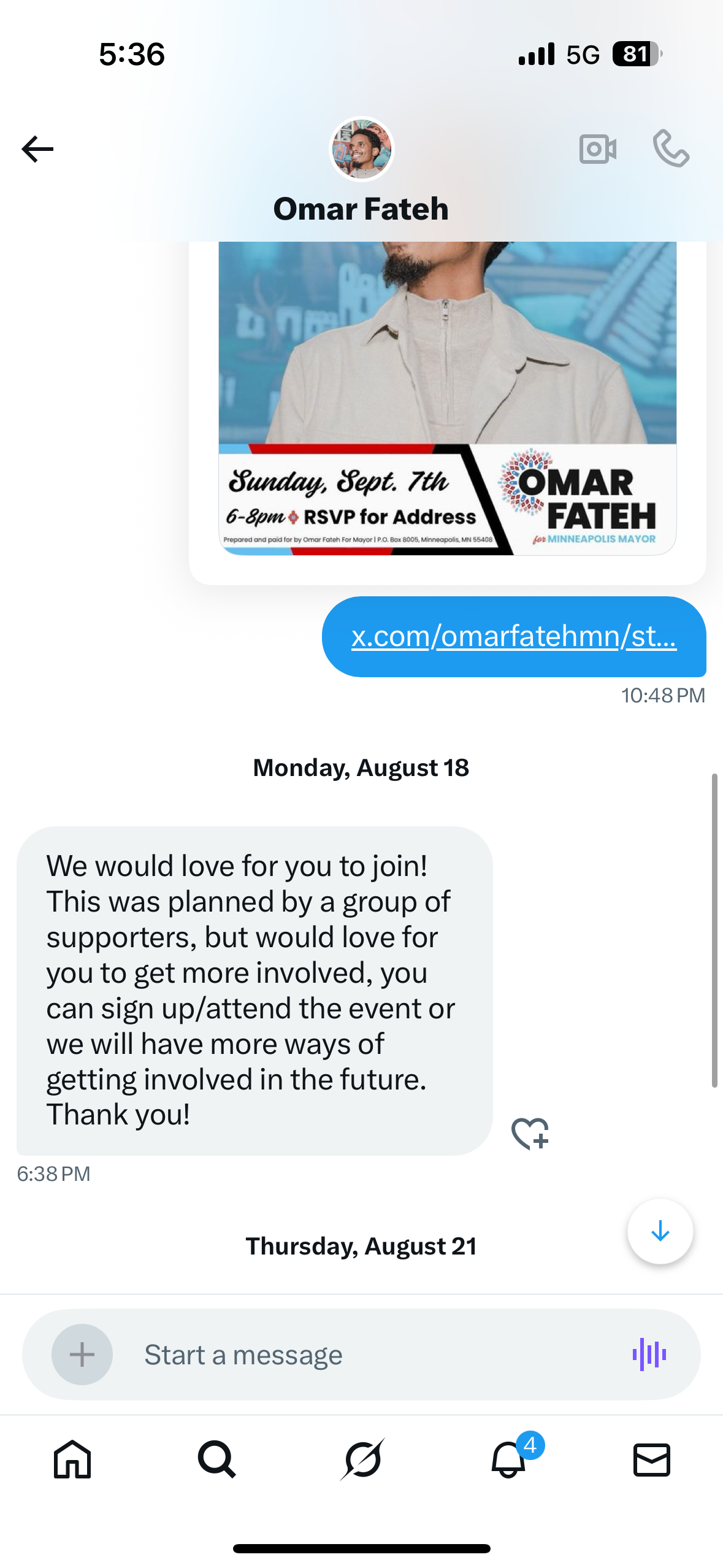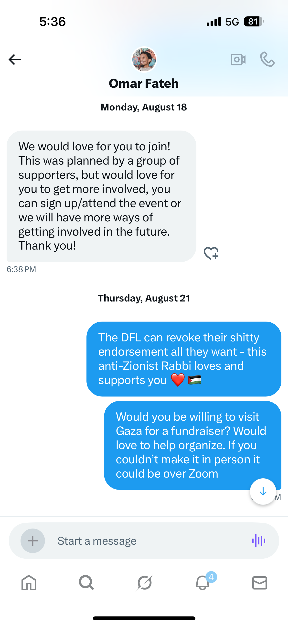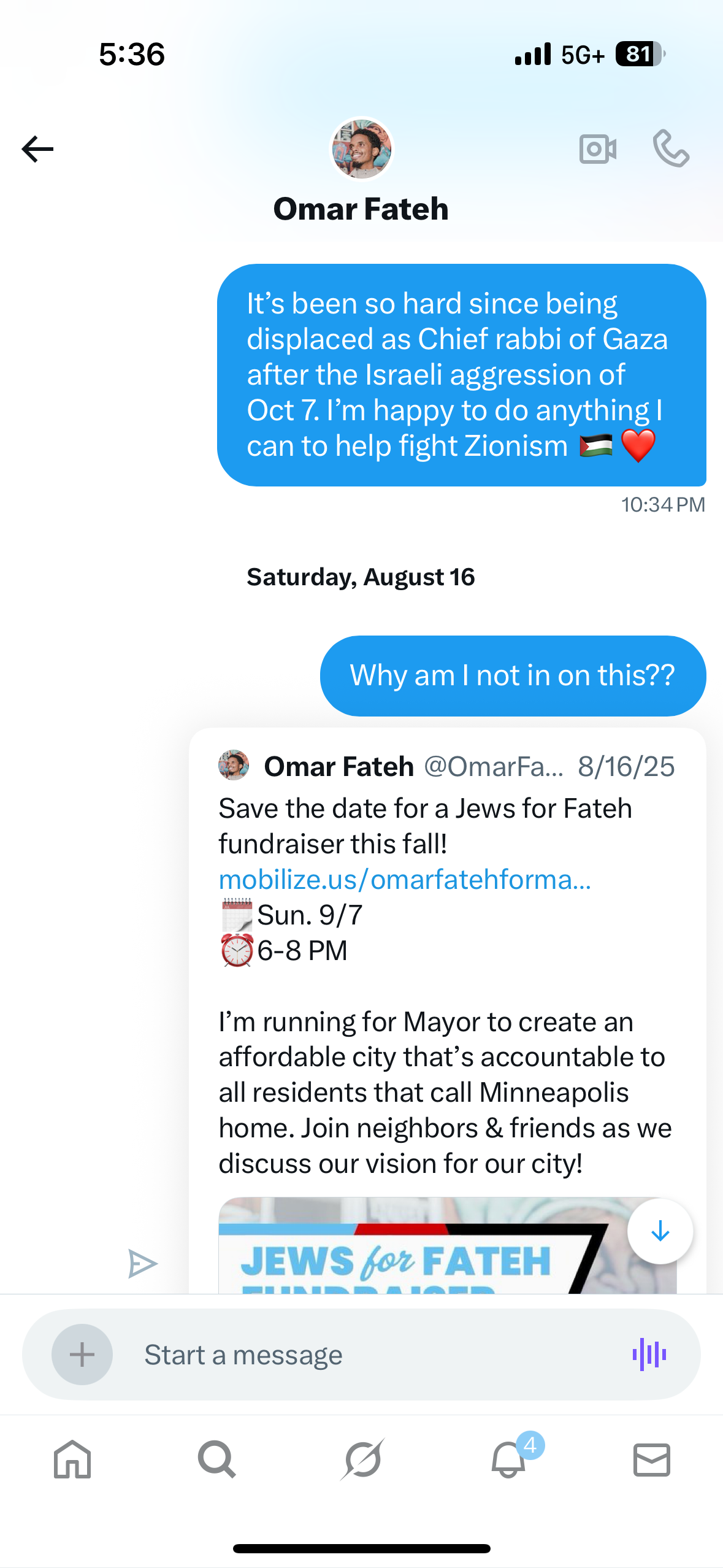 Minneapolis mayoral candidate Omar Fateh engaged in a series of friendly conversations with a parody X account masquerading as the “chief rabbi of Gaza” and “nude yogi,” screenshots shared with the Washington Free Beacon show.