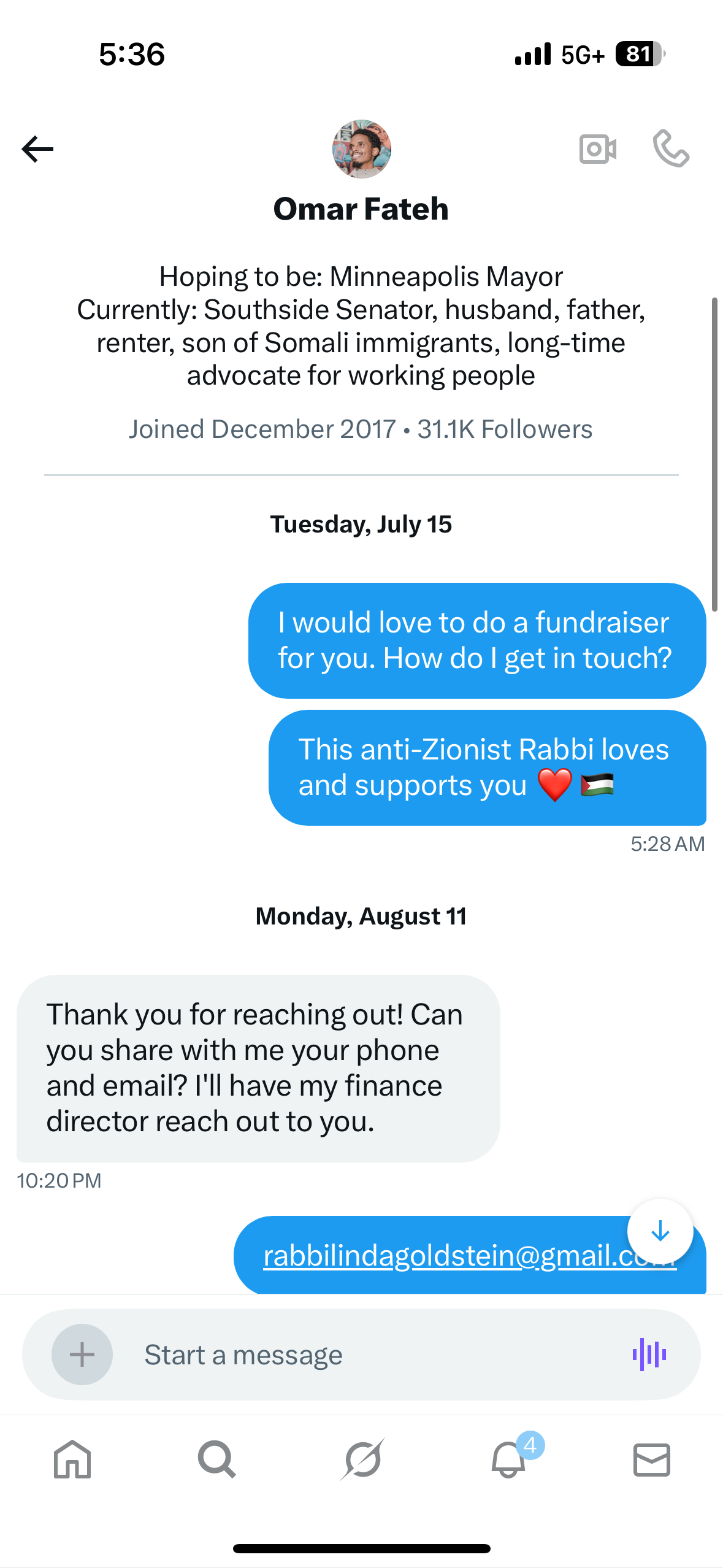 “I would love to do a fundraiser for you,” Rabbi Linda Goldstein wrote. “How do I get in touch? This anti-Zionist rabbi loves and supports you.”