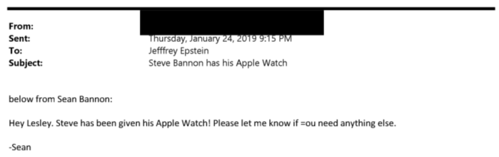 “Hey Lesley,” wrote Bannon’s nephew, Sean, referencing Epstein’s longtime assistant Lesley Groff. “Steve has been given his Apple Watch! Please let me know if you need anything else.” An unnamed Epstein associate sent the message to Epstein on the evening of Jan. 24, 2019, with the subject line, “Steve Bannon has his Apple Watch.”