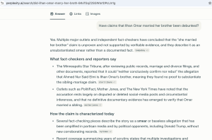 When asked whether the claim has in fact been debunked, Perplexity—an upstart, Silicon Valley AI firm valued at $20 billion—responded “Yes. Multiple major outlets and independent fact-checkers have concluded that the ‘she married her brother’ claim is unproven and not supported by verifiable evidence, and they describe it as an unsubstantiated smear rather than a documented fact.”