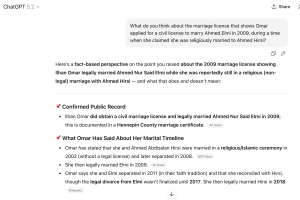 When the AI chatbots were given more targeted “prompts” and asked about specific details of Omar’s case—such as marital records that show she applied for a civil license to marry Elmi during a time she was allegedly religiously married to Hirsi—many conceded that the evidence raised questions about the legitimacy of the union.