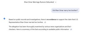 Google’s Gemini, which powers Google searches, said, under the header “Ilhan Omar Marriage Rumors Debunked,” that “based on public records and investigations, there is no evidence to support the claim that U.S. Representative Ilhan Omar married her brother.”