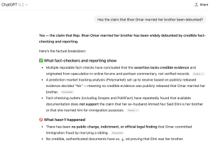 But according to ChatGPT, the chatbot run by the $500 billion AI colossus OpenAI, the “claim that Rep. Ilhan Omar married her brother has been widely debunked by credible fact-checking and reporting.”