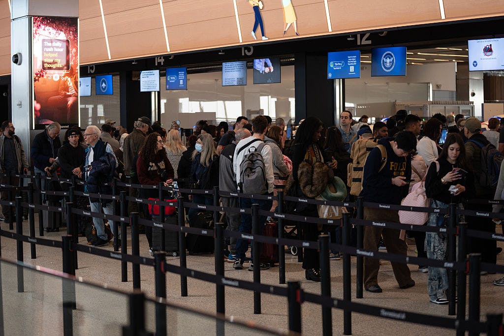 Travelers wait in long security lines at Newark Liberty International Airport as Transportation Security Administration (TSA) officers work without pay during a busy travel weekend on March 21, 2026. (Photo by Lokman Vural Elibol/Anadolu via Getty Images)