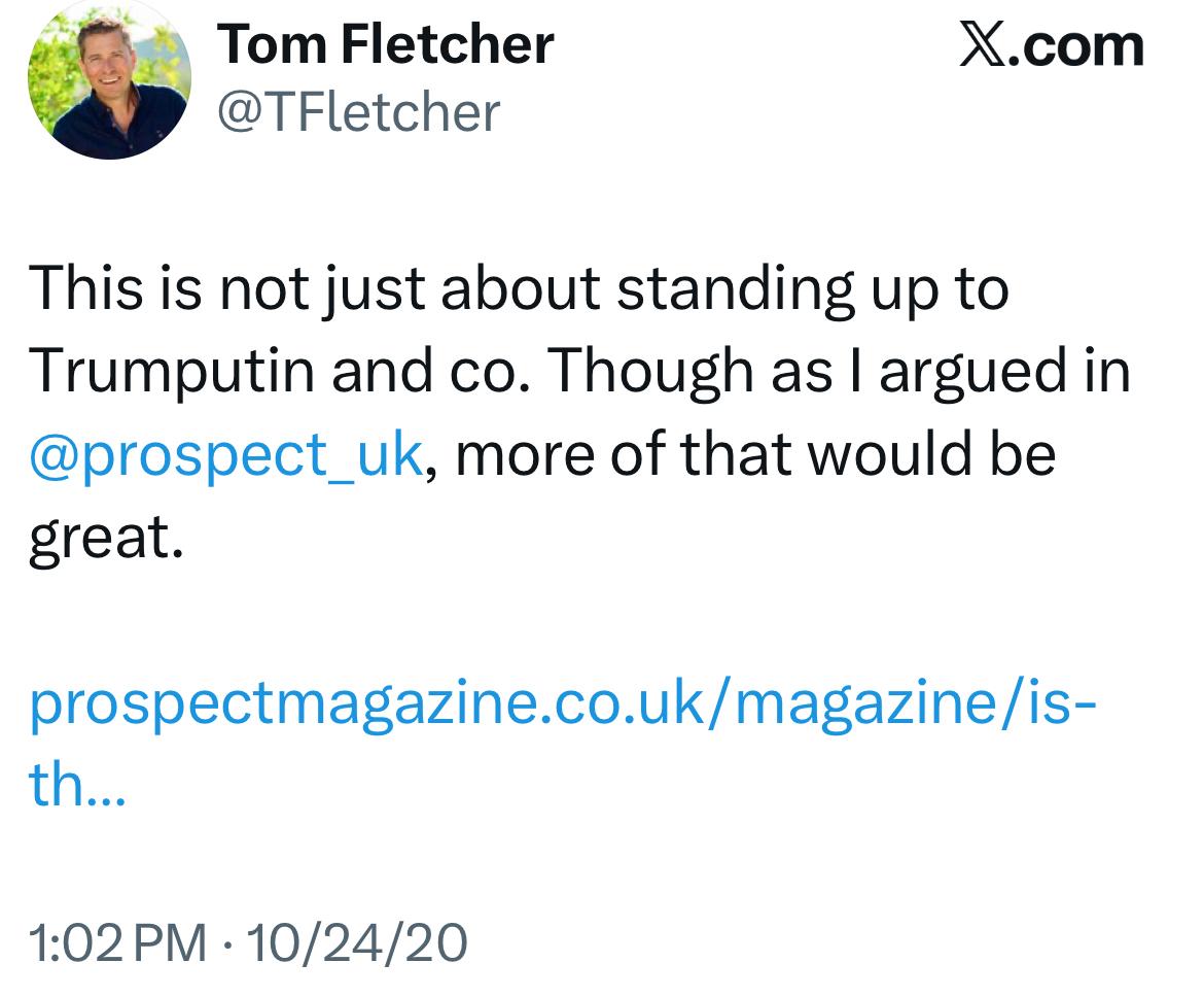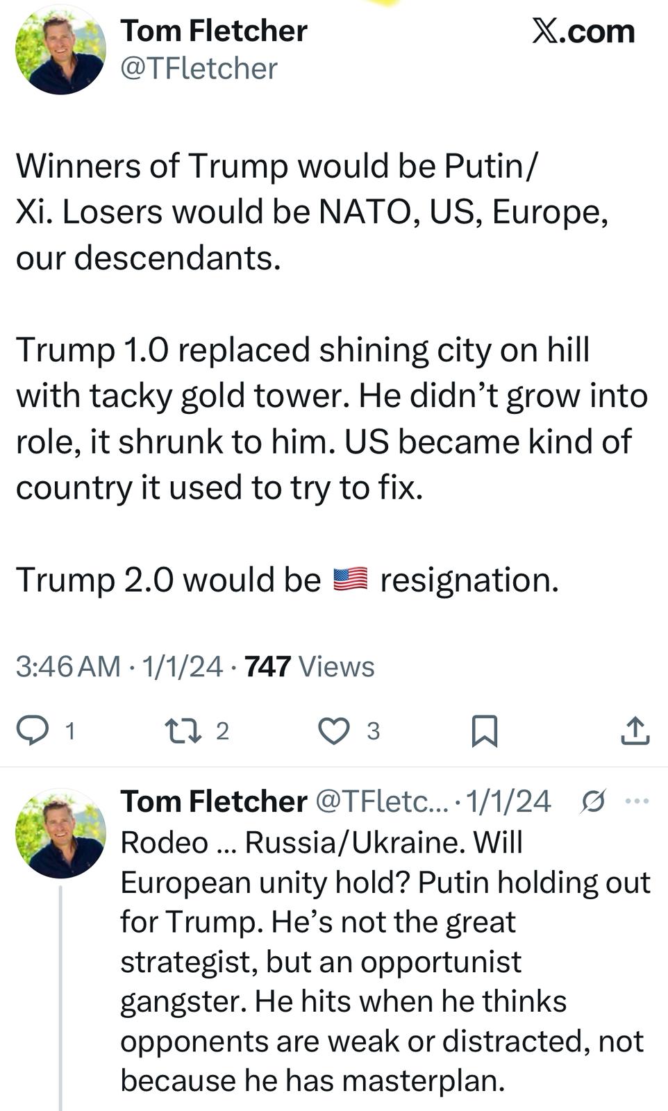 In January 2024, for instance, Fletcher wrote that a Trump victory in that year’s presidential election would mean victories for Russian president Vladimir Putin and Chinese president Xi Jinping. In his first term, Trump “replaced shining city on hill with tacky gold tower,” Fletcher continued.