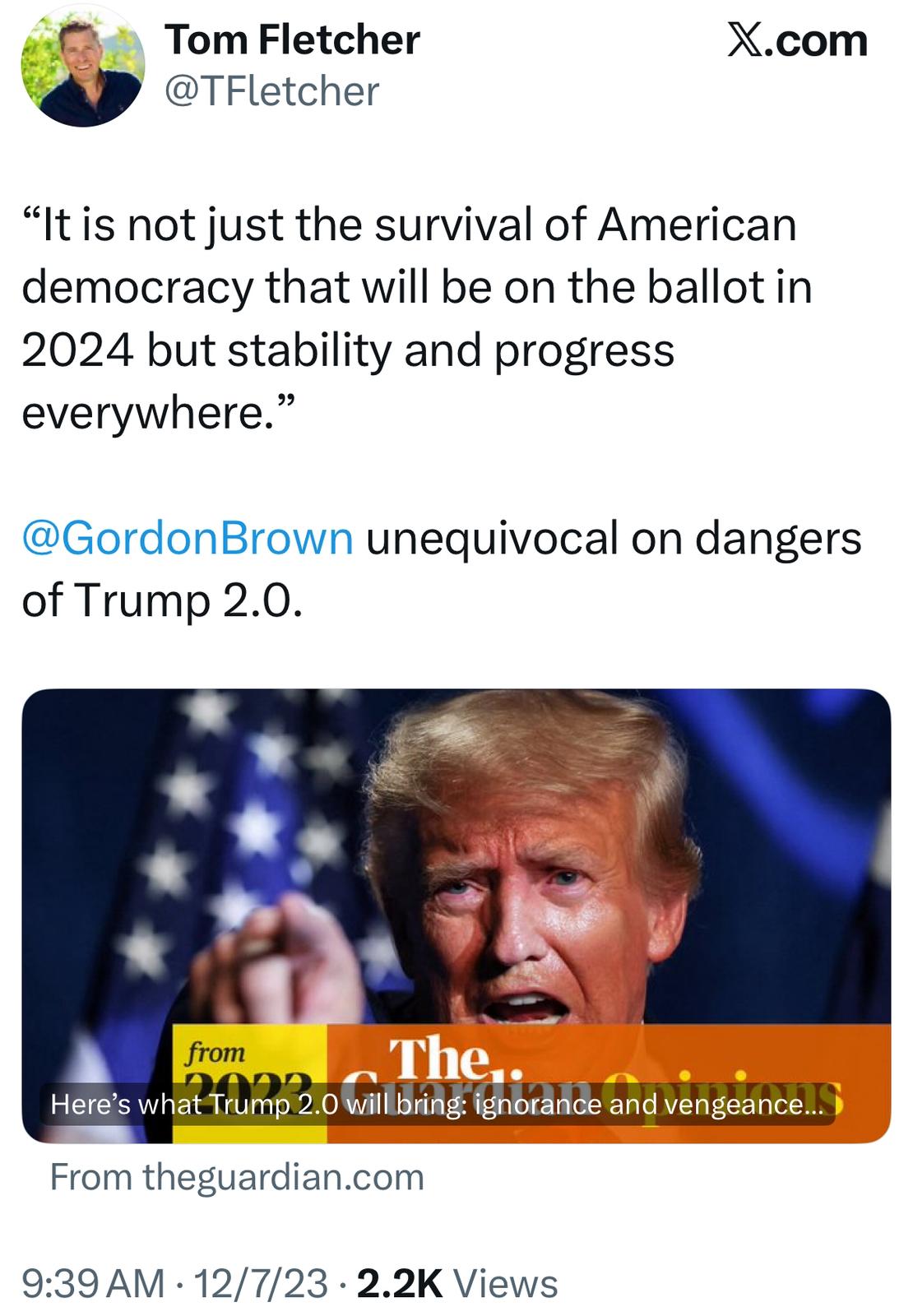 Less than a month earlier, Fletcher approvingly shared an op-ed by U.N. special envoy for global education and former U.K. prime minister Gordon Brown in which Brown argued “American democracy” would be “on the ballot in 2024.”