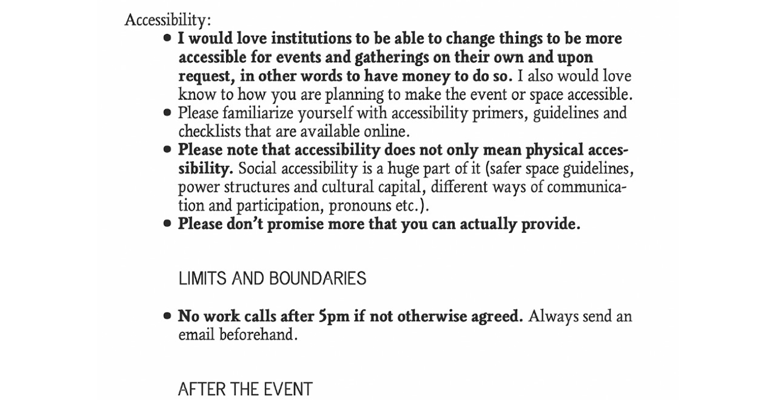 While “access riders” are typically used by disabled students and professional artists to ensure legitimate special needs are met, the professors laid out a broad range of demands students might make of artistic “collaborators.” A PowerPoint presentation curated by WARP professors gave the following examples and told students, quoting the artist Johanna Hedva, that “access documents are used by rock stars and divas all the time—they’re simply called riders and no one bats an eye. This is because they are helpful for everyone involved.” The presentation encouraged students to “normalise asking collaborators for access riders!”