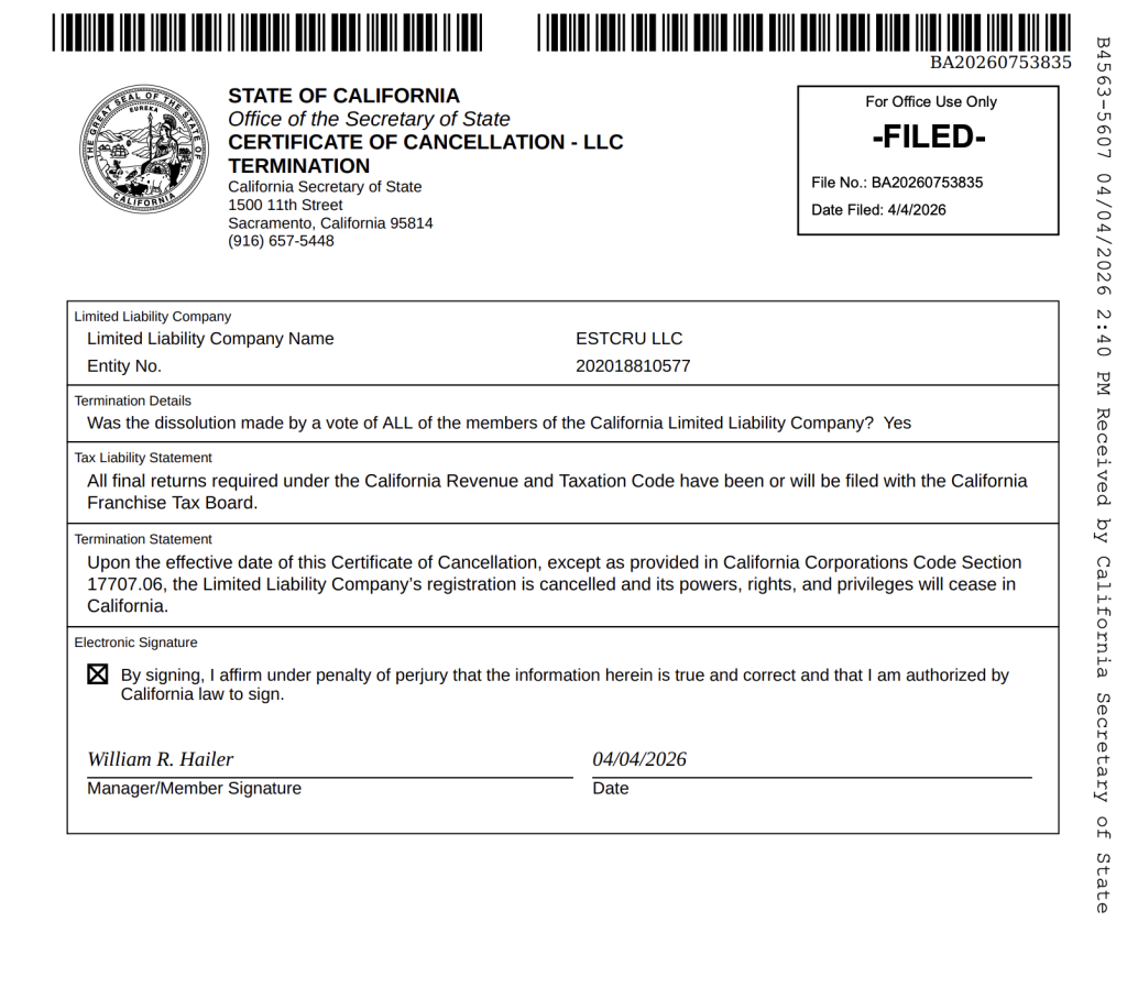 eStCru LLC filed for termination roughly one week after Omar submitted an amended financial disclosure that listed the winery as having no value