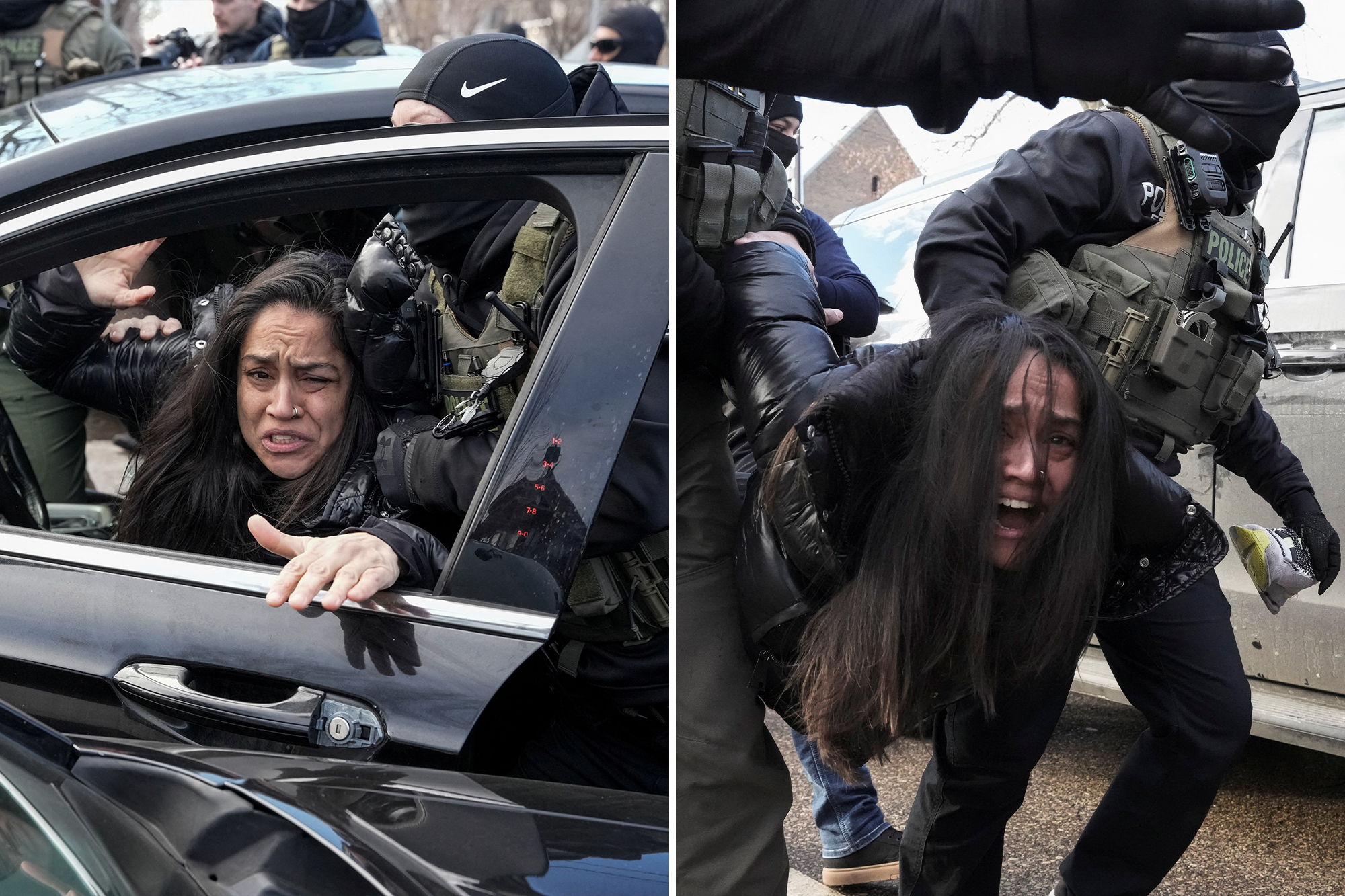 Agents pushed her up against the side of the car and handcuffed her as others yelled, “stop,” “that’s so f—– up,” “all you do is hurt.”