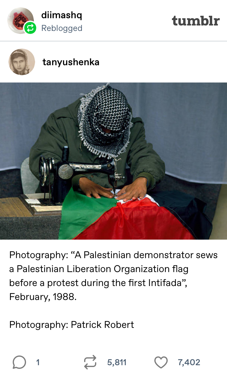 Duwaji posted another photo on her Tumblr account in December 2017, this one showing a keffiyeh-clad Palestinian sewing a flag.