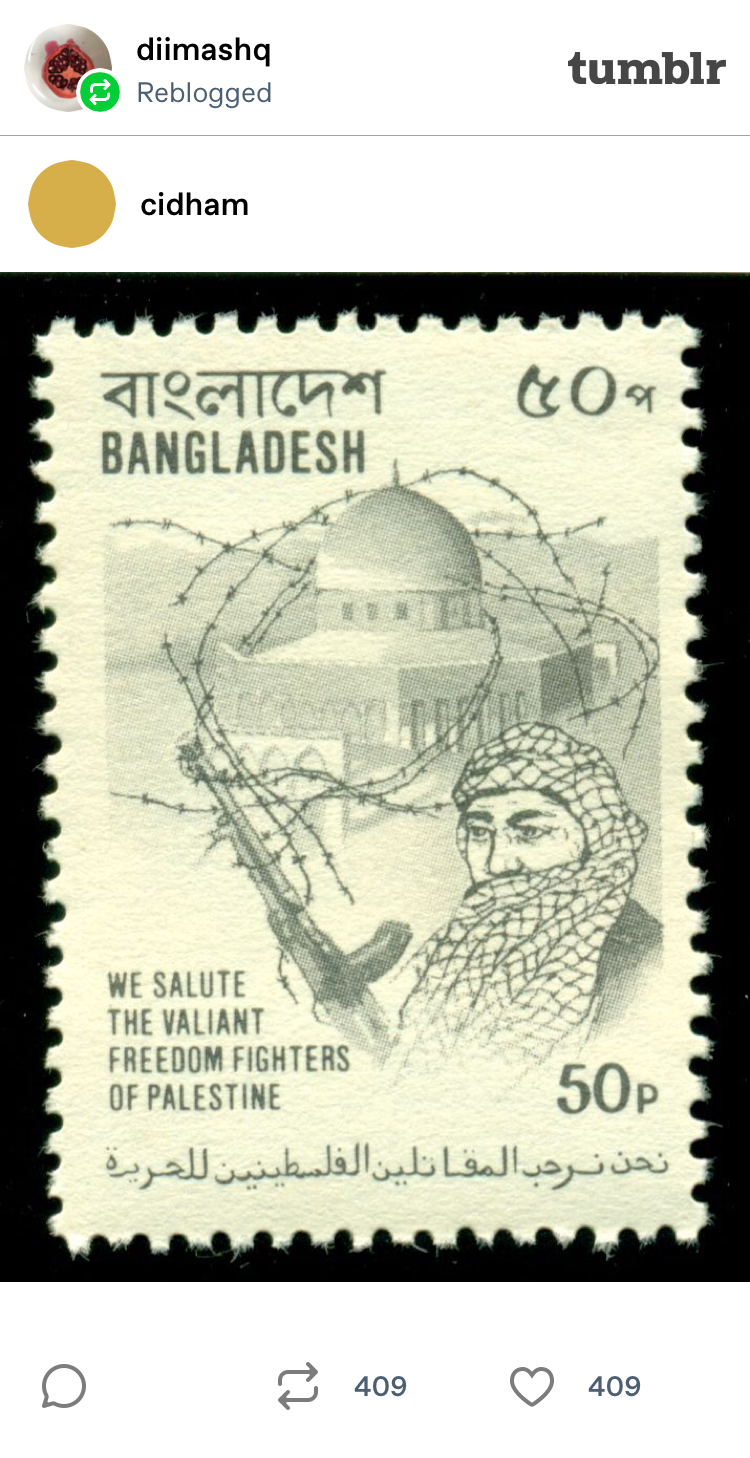 In September 2017, Duwaji shared an image of a Bangladeshi postage stamp reading, “We salute the valiant freedom fighters of Palestine.”