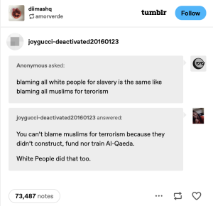 In December of that year, she reposted another Tumblr user who said white people created al Qaeda.